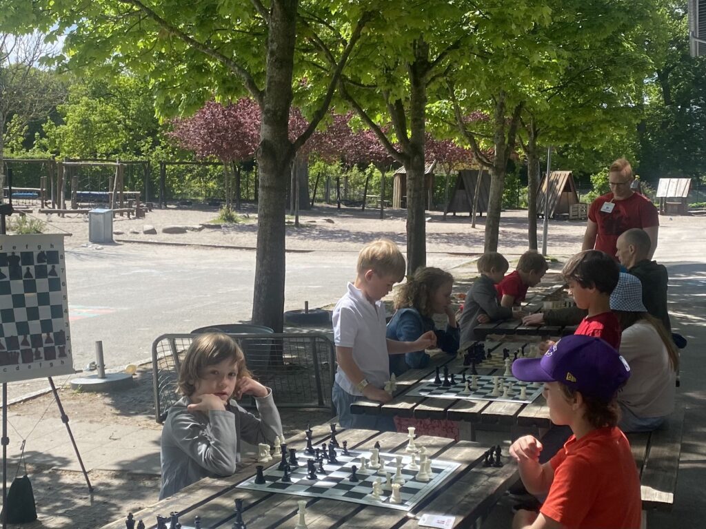 I dag har vi afholdt vores første undervisningsgang udenfor. Det fungerede superfint og det er bestemt ikke sidste gang, vi gør det 🙂 Vi startede ud med frit spil, hvorefter undervisningen gik i gang. Som det er tradition, fik børnene øvet sig på navnene på skakfelterne og skulle beslutte det næste fællestræk mod Holtekolle-trolden. Herefter viste Christian forskellige spilopsætninger der handlede om beskyttelse, dobbeltbeskyttelse og sågar gensidig beskyttelse! Til sidst var der opgaver og frit skakspil, hvorefter vi, som traditionen også foreskriver, sluttede af med fodboldspil. Tusind tak for i dag 🙂